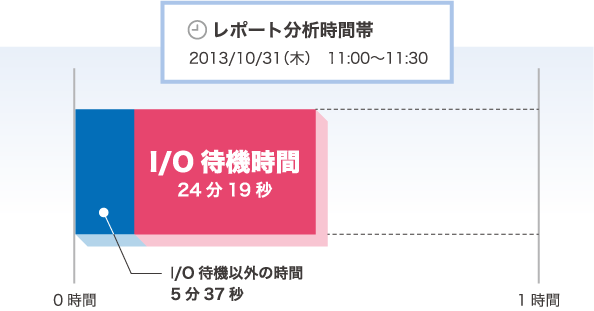 OracleのI/O待機イベント発生率が最も高い時間帯の30分間を対象として分析したところ、Oracleの処理時間は29分56秒で、そのうちの81%、24分19秒がI/O待機時間であることがわかりました。
